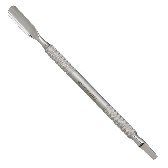 דוחף עור דו-צדדי מדגם MASTER 43 TYPE 2 מבית NagelMeister, תוצרת Solingen, גרמניה – מיועד לשימוש מקצועי במניקור ופדיקור. מצויד בידית אחיזה נוחה ומחוספסת למניעת החלקה, ובשני ראשים: צד אחד עם דוחף מעוגל להסרה עדינה של עור עודף, וצד שני עם להב ישר להסרה יסודית של עור דבוק, קשה או עיקש במיוחד. הכלי עמיד, מדויק ומושחז ידנית לרמת ביצועים גבוהה במיוחד.