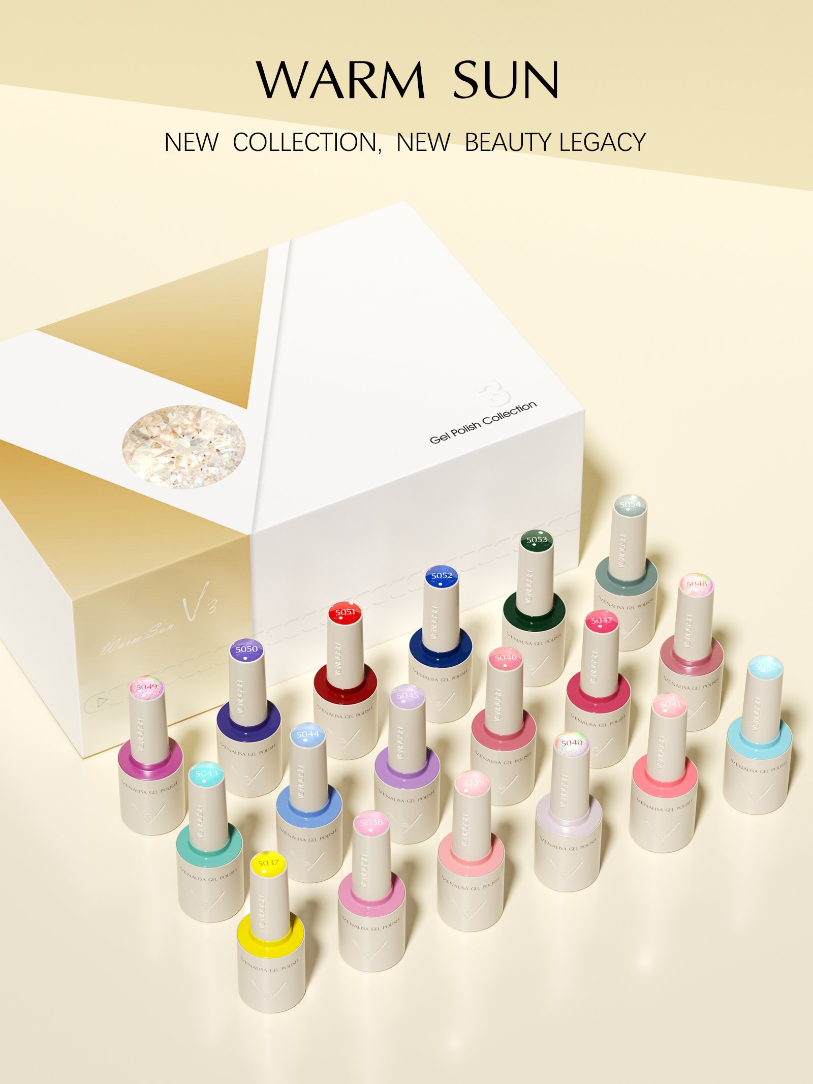הסט כולל את כל 18 הגוונים בסדרת WARM SUN – מס' 5037 עד 5054 , בגימור אטום, סופר-פיגמנטי ובצבעים תואמים בדיוק למה שרואים על הבקבוק.
