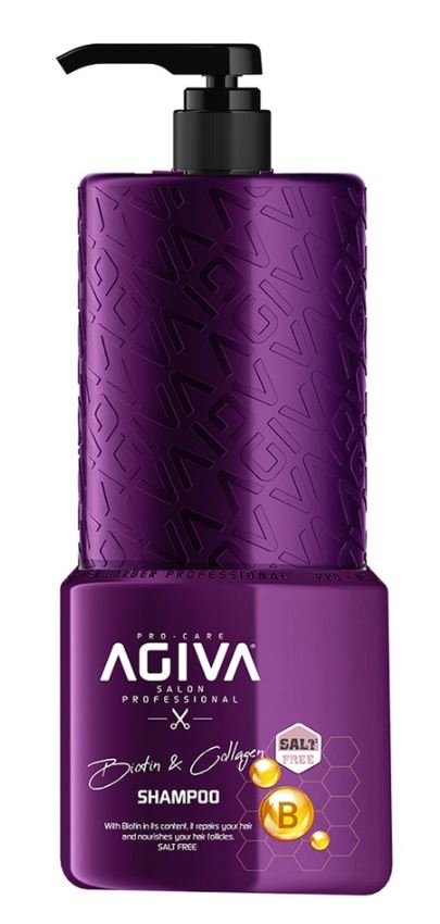 שמפו Agiva Biotin & Collagen בנפח 800 מ"ל, ללא מלחים, מועשר בביוטין וקולגן לשיקום שיער דק, הענקת נפח, חיזוק וברק. מתאים לשיער יבש, פגום או צבוע.