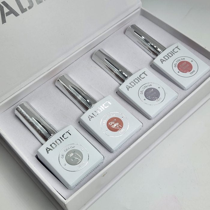 מארז יוקרתי הכולל 4 בקבוקי בסיס צבעוני מבית ADDICT, המיועדים לבניית ציפורניים בגוונים טבעיים ומושלמים לכל עיצוב.