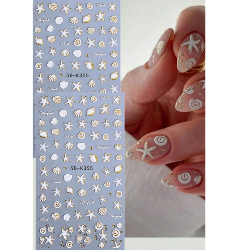 מדבקות ציפורניים 5D בצבע לבן וזהב | דפי צדפים וכוכבי ים | 2 יחידות