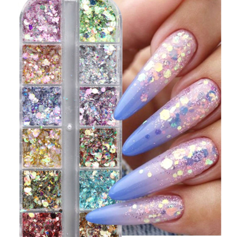 קופסת נצנצים הולוגרפיים לציפורניים | 12 תאים