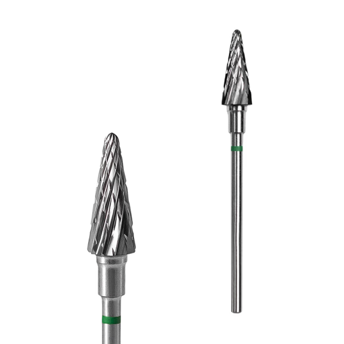 מקדח קרביד מקצועי בצבע ירוק מבית STALEKS PRO, עם ראש בצורת חרוט (Cone) בקוטר 6 מ"מ ואורך חלק עבודה 14 מ"מ. תוכנן במיוחד להסרה יעילה של חומרי בנייה (ג'ל, אקריל, פוליג'ל) תוך שמירה על דיוק ונוחות מקסימלית למשתמשת. מתאים למכונות שיוף מקצועיות ועומד בתקנים בינלאומיים מחמירים.